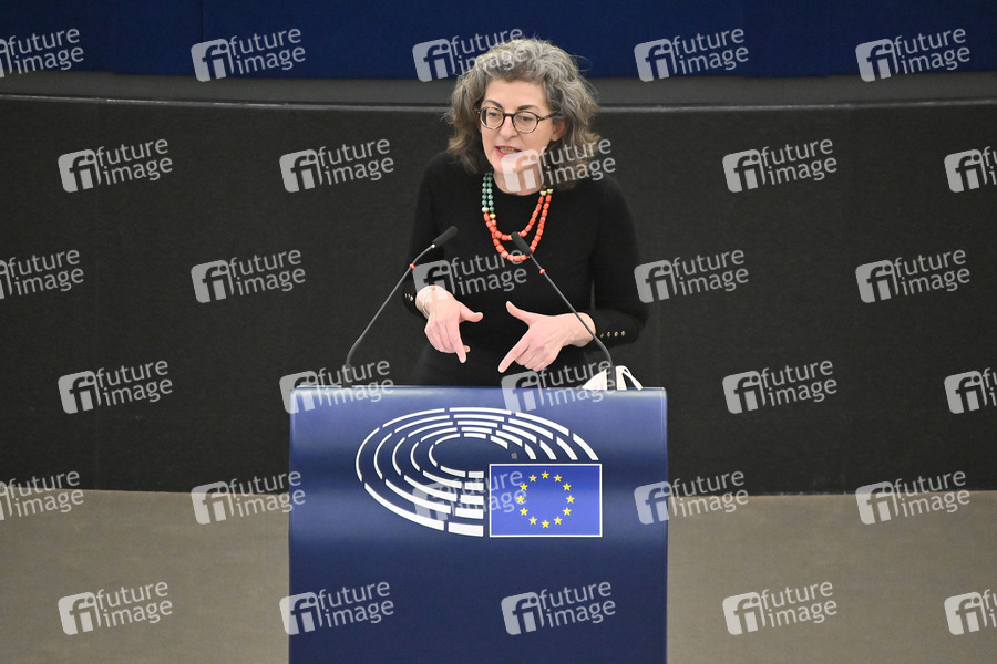 Maite Pagazaurtundua bei einer Plenartagung zur Zusammenarbeit und Gemeinsamkeiten des Putin-Regimes und rechtsextremer sowie separatistischer Bewegungen in Europa im Plenarsaal des Europäischen Parlaments. Straßburg, 06.04.2022
