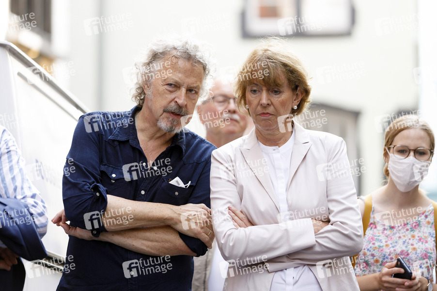 Wolfgang Niedecken und Henriette Reker bei der Aktion 'Glanz statt Hetze', bei der im Gedenken an die Opfer der NS-Zeit sogenannte Stolpersteine gereinigt werden. Sie erinnern an deportierte und ermordete Kölner Jüdinnen und Juden, an Sinti und Roma, politisch Verfolgte, Homosexuelle, Zwangsarbeiter, Zeugen Jehovas und Opfer der 'Euthanasie'. Köln, 12.08.2020