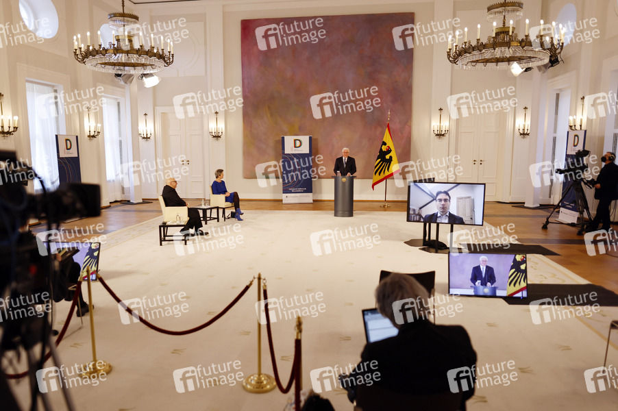 Armin Nassehi, Margrethe Vestager und Frank-Walter Steinmeier beim 11. Forum Bellevue: 'Demokratie und digitale Öffentlichkeit - Eine transatlantische Herausforderung' im Schloss Bellevue. Berlin, 01.03.2021