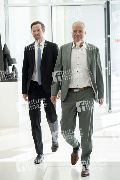 Dirk Wiese und Matthias Miersch bei der Klausursitzung des SPD-Parteivorstandes im Reichstagsgebäude. Berlin, 08.09.2025