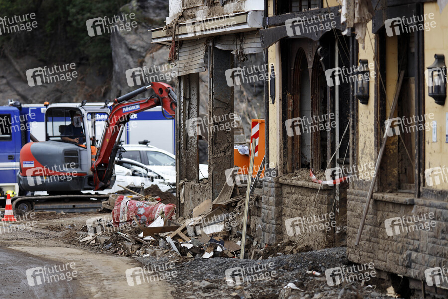 Nach dem Jahrhunderthochwasser in der Eifel durch heftige Regenfälle und Dauerregen mit Überschwemmungen und Überflutungen haben die Aufräumarbeiten im Ahrtal große Fortschritte gemacht. Einheiten von Polizei, THW, Bundeswehr und Feuerwehr mitsamt vielen freiwilligen Helfern haben Straßen geräumt, Schutt und Schlamm entfernt und die Menschen versorgt. Der Wiederaufbau wird trotzdem Jahre dauern. Im Bild Flutschäden in der Ortschaft Mayschoß, in der die Flut viele Häuser zerstörte, 08.08.2021