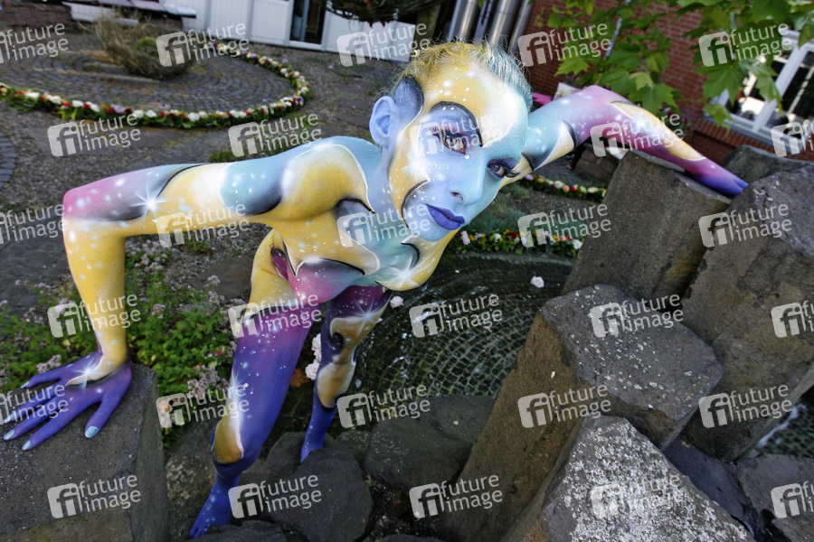 Bodypainting und Fotoshooting mit Model Sarah am Tag der offenen Tür der Meisterschule Justus-von-Liebig-Schule, Abteilung Floristik in Hannover-Ahlem. Künstler: Jörg Düsterwald
