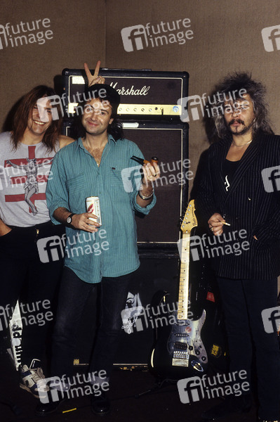 Michael 'Würzel' Burston, Phil 'Wizzö' Campbell und Phil 'Philthy Animal' Taylor von Motörhead bei einem Photoshooting im Tonstudio. London, 12.12.1991