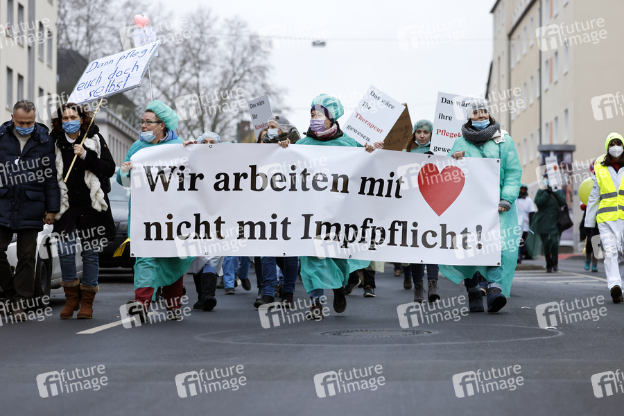 Bei einer angemeldeten Demo demonstrierten etwa 8000 Gegner einer Impfpflicht mit einem Spaziergang gegen die Corona-Maßnahmen der Bundesregierung - darunter auch viele Pflegekräfte, die wegen der Impfpflicht im Gesundheitsbereich ihren Job zu verlieren drohen. Düsseldorf, 15.01.2022