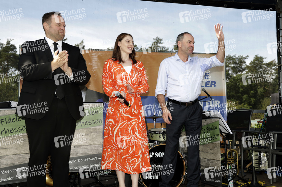 Engin Eroglu, Laura Schulz und Hubert Aiwanger bei einer Wahlkampfveranstaltung der Freien Wähler Hessen auf dem Bioenergiehof 'Vor den Tannen'. Wetter, 02.09.2023