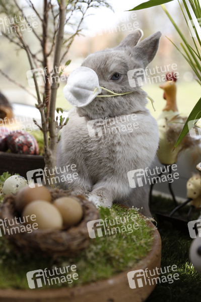 Hase, Osterhase, Kaninchen, Zwergkaninchen, Easter Bunny, Frohe Ostern, Oster-Geschenke, Ostern, Osternest, Ostersaison, Osterzeit, Ostereier, Feiertag, Ostersonntag, Ostermontag, Atemschutz, Atemschutzmaske, Virenschutz, Schutzmaske, Schutzmasken, Atemschutzmasken, Mundschutz, Mund-Schutz, Mundschutzpflicht, Mundschutz-Pflicht, Mund-Nase-Schutz, Mund-Nasen-Schutz, MNS, Ausbreitung, Maskenzwang, Maskenpflicht, Infektionsgefahr der Öffentlichkeit, Lock Down, Lockdown, Öffentlichkeit, Eindämmung, Seucheneindämmung, anstecken, infizieren, Vorbeugung, Prävention, schützen, Einschränkung, Verzicht, Seuchenschutz, Corona-Schutz, Virus, Viren, Corona, Sars-CoV-2, Covid-19, Coronavirus, Coronaviren, Corona-Virus, Corona-Viren, Ansteckung, Ansteckungsgefahr, Epidemie, Pandemie, Infektion, Infektionen, Corona-Maßnahmen, Symbolfoto, Symbolbild