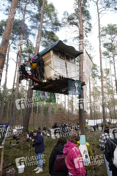 Das Protestcamp von Umweltaktivisten in Grünheide richtet sich gegen die Erweiterungspläne des Tesla-Werks. Die Aktivisten werfen Tesla vor, Umweltverstöße zu begehen, Trinkwasser zu gefährden und Abwasser-Grenzwerten zu überschreiten. Seit Donnerstag halten die Aktivisten einen Teil des Landeswaldes besetzt, den Tesla im Falle einer Erweiterung seines Geländes roden will. Sie haben um die zehn Baumhäuser in mehreren Metern Höhe errichtet und kündigten an, möglichst lange ausharren zu wollen. Auch die Bürgerinitiative Grünheide spricht sich gegen die Erweiterungspläne aus und zeigt sich mit den Besetzern solidarisch. Grünheide, 02.03.2024