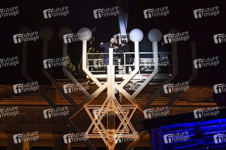 Jens Spahn und Rabbiner Yehuda Teichtal beim Zünden der ersten Kerze am Chanukka-Leuchter anlässlich der beginnenden Chanukka-Feiertage am Brandenburger Tor. Berlin, 10.12.2020
