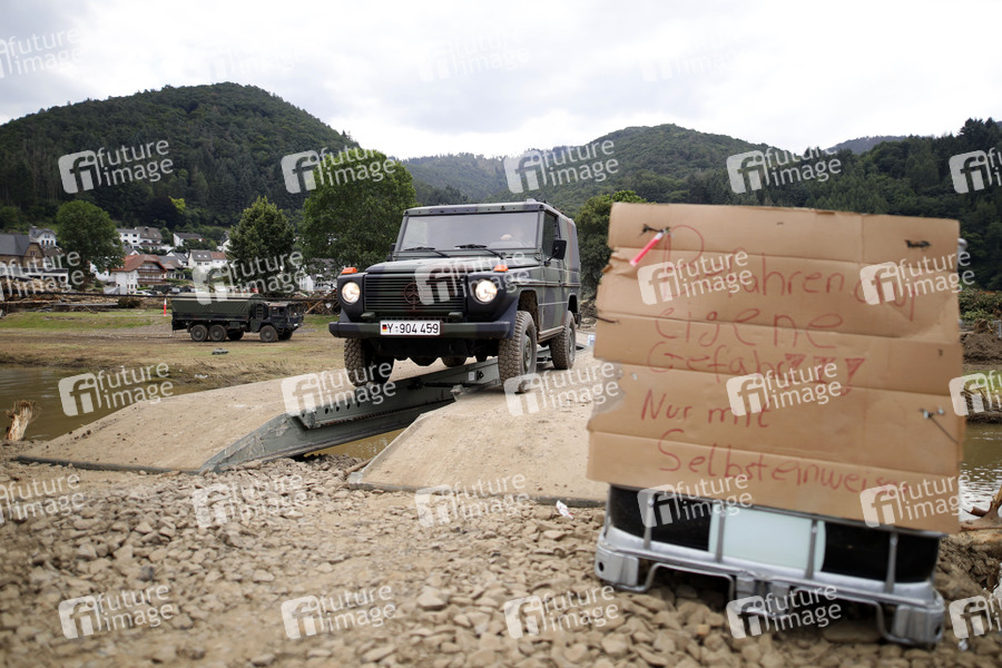 Nach dem Jahrhunderthochwasser in der Eifel durch heftige Regenfälle und Dauerregen mit Überschwemmungen und Überflutungen haben die Aufräumarbeiten im Ahrtal begonnen. Einheiten von Polizei, THW, Bundeswehr und Feuerwehr mitsamt vielen freiwilligen Helfern räumen Straßen, entfernen Schutt und Schlamm und versorgen die Menschen. Im Bild eine von Bundeswehr-Pionieren errichtete Behelfsbrücke in der Ortschaft Rech, in der die Flut viele Häuser zerstörte, 22.07.2021