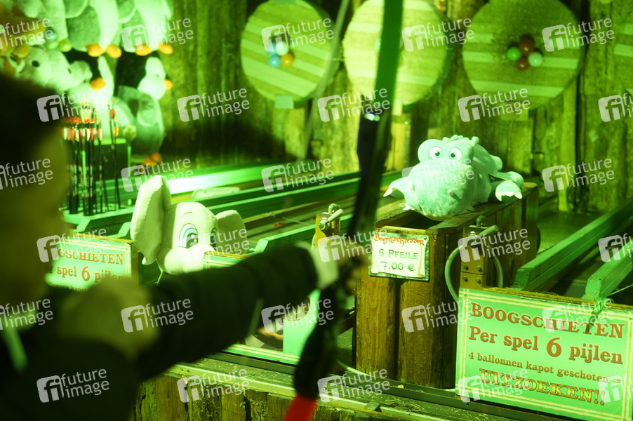 Bogen-Schießstand auf dem Weihnachtsmarkt 'Lichtenberger Winterzeit' an der Landsberger Allee im Berliner Bezirk Lichtenberg. Berlin, 03.11.2024