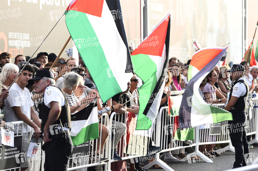 Anti-Israel-Demo, Demonstration, Protest, Filmpremiere, Premiere, Kino, Film, Eröffnung, Opening Ceremony, Eröffnungsgala, Roter Teppich, Ankunft, Unterhaltung, Entertainment, Kultur, Filmfest, Internationales Filmfestival, SSIFF, 73rd San Sebastian International Film Festival, Donostia Zinemaldia - Festival de San Sebastián