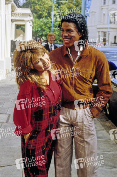 Pia Zadora und Jermaine Jackson beim Photocall vor einem Hotel. London, 10.09.1984