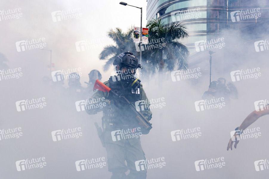 Polizisten in Tränengaswolke - Belagerung an der Polytechnischen Universität. Die Polizei umstellt den Campus der Universität, nachdem Demonstranten den Cross-Harbor-Tunnel und die Hauptstraße außerhalb des Campus blockiert haben. Hongkong protestiert seit fünf Monaten ununterbrochen. Am Montag, dem 11. November 2019, begann ein Streik in der ganzen Stadt, der Teile von Hongkong zum Erliegen brachte, als MTR-Stationen geschlossen und mehrere Straßensperren errichtet wurden. Hongkong, 18.11.2019