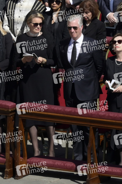 Mathilde, Königin der Belgier und Philippe, König der Belgier bei der Trauermesse für den verstorbenen Papst Franziskus auf dem Petersplatz. Vatikanstadt, 26.04.2025