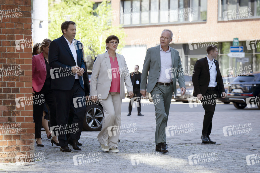 Lars Klingbeil, Saskia Esken und Matthias Miersch beim Bildtermin mit dem SPD-Regierungsteam im Vorfeld der Unterzeichnung des Koalitionsvertrages zwischen CDU, CSU und SPD im Gasometer Schöneberg. Berlin, 05.05.2025