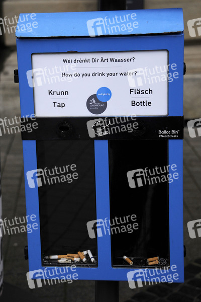 Großherzogtum Luxemburg, Ballot Pins, Wahlurne Aschenbecher, Ascher, Kippen in den Kasten, Müllvermeidung, Umweltschutz, Kreislaufwirtschaft, Sauberkeit, Umweltverschmutzung, Recyceln von Zigarettenfiltern, Kippen, Zigarettenkippen, Zigaretten, Zigarette, Zigarettenstummel, Symbolfoto, Symbolbild