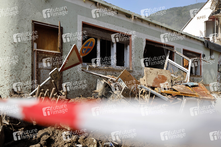 Nach dem Jahrhunderthochwasser in der Eifel durch heftige Regenfälle und Dauerregen mit Überschwemmungen und Überflutungen haben die Aufräumarbeiten im Ahrtal begonnen. Einheiten von Polizei, THW, Bundeswehr und Feuerwehr mitsamt vielen freiwilligen Helfern räumen Straßen, entfernen Schutt und Schlamm und versorgen die Menschen. Im Bild zerstörte Häuser in der Ortschaft Altenahr, in der die Flut viele Häuser zerstörte, 22.07.2021