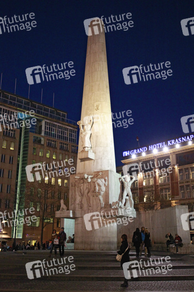 Dam Platz, niederländisches Nationaldenkmal, Obelisk aus Beton und Travertin, 22 Meter hoch, erbaut 1956, Denkmal, Mahnmal, Nachtaufnahme