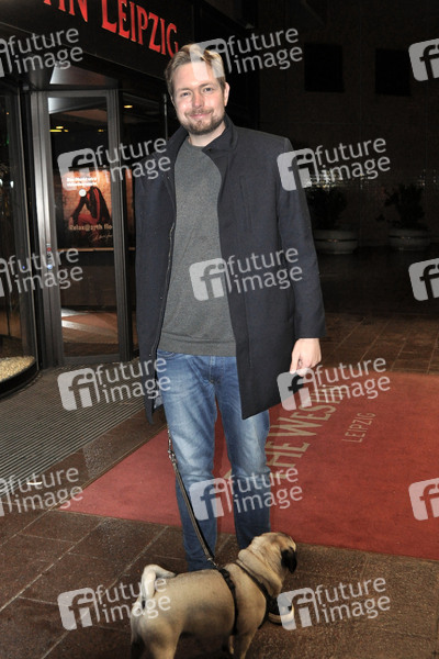 Bastian Bielendorfer mit Mops Otto bei der Ankunft zur TV-Aufzeichnung der Talkshow 'Riverboat' im Studio 3 der Media City Leipzig. Leipzig, 20.10.2020