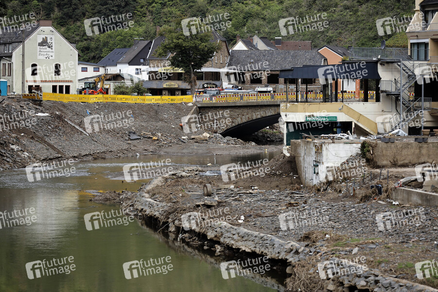 Nach dem Jahrhunderthochwasser in der Eifel durch heftige Regenfälle und Dauerregen mit Überschwemmungen und Überflutungen haben die Aufräumarbeiten im Ahrtal große Fortschritte gemacht. Einheiten von Polizei, THW, Bundeswehr und Feuerwehr mitsamt vielen freiwilligen Helfern haben Straßen geräumt, Schutt und Schlamm entfernt und die Menschen versorgt. Der Wiederaufbau wird trotzdem Jahre dauern. Im Bild Flutschäden in der Ortschaft Altenahr, in der die Flut viele Häuser zerstörte, 08.08.2021