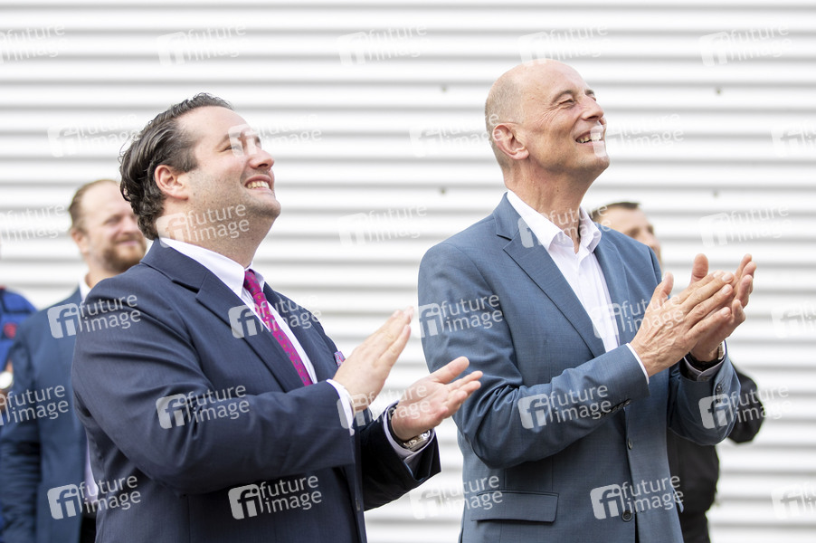 Sven J. Köllmann und Wolfgang Tiefensee beim Richtfest des neuen Hotels an der Messe Erfurt. Die Légère Hotelgruppe übernimmt die Leitung. Erfurt, 16.07.2021