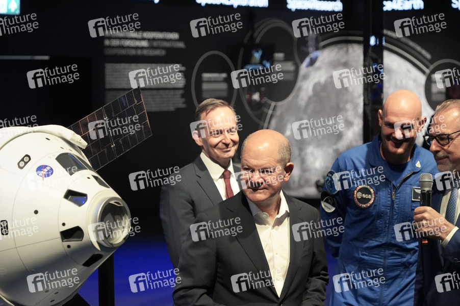 Volker Wissing, Olaf Scholz und Alexander Gerst am Stand der ESA vor einem Modell der Raumkapsel Orion beim Eröffnungsrundgang der ILA Berlin auf dem ILA-Gelände am Flughafen BER Berlin-Brandenburg. Berlin, 05.06.2024