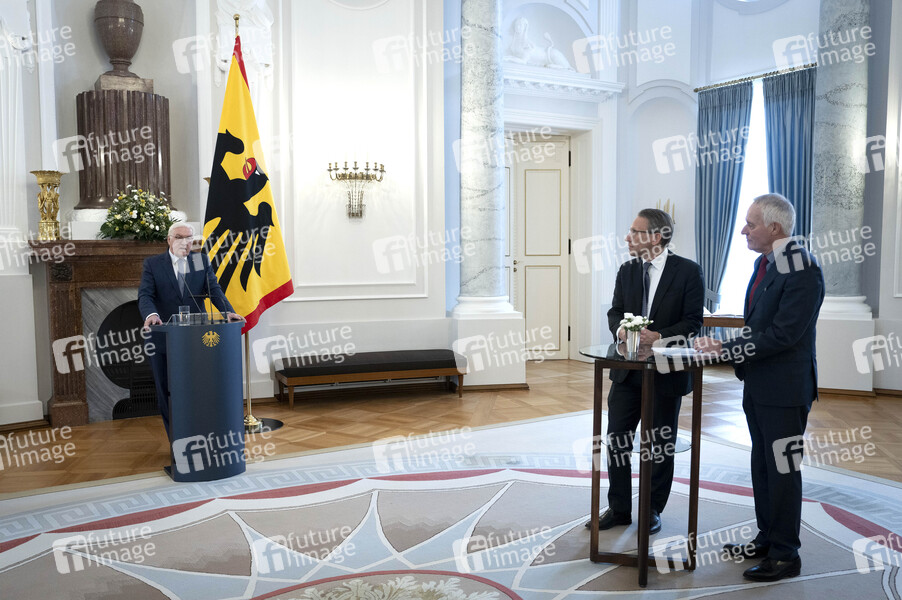 Frank-Walter Steinmeier, Jörg Kukies und Achim Meyer auf der Heyde bei der Übergabe der Wohlfahrtsmarken 2025 durch den Bundesminister der Finanzen an den Bundespräsidenten im Schloss Bellevue. Berlin, 21.02.2025