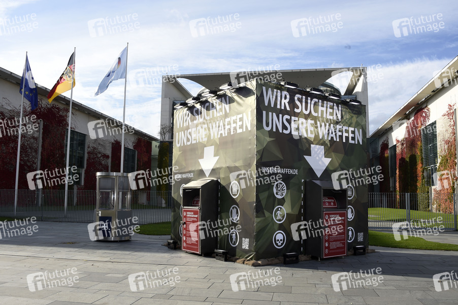 Die Aktionskünstler des Zentrums für Politische Schönheit protestieren mit einer neuen Aktion vor dem Kanzleramt gegen Rechtsextremismus in der Bundeswehr. Die Gruppe errichtete eine 'Waffen-Rückgabecontainer-Station', dort sollen vermisste Waffen der Bundeswehr zurückgegeben werden Die Aktion der Gruppe steht unter dem Motto 'Wo sind unsere Waffen?', auf einer Website haben die Künstler verschwundene Kampfmittel der Bundeswehr aufgelistet. Es fehlten 70.000 Schuss Munition und 60 Kilogramm Sprengstoff, heißt es dort unter Verweis auf Angaben der Bundeswehr (Quelle: spiegel.de). Berlin, 27.10.2020