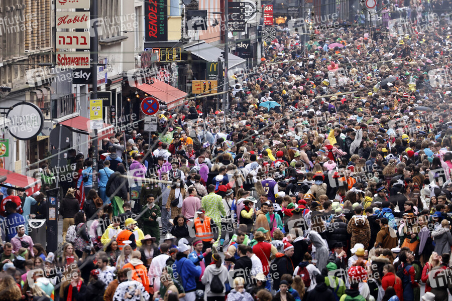 Karneval, Brauchtumszone, Brauchtum, Corona, Corona-Maßnahmen, 3G, 2G, 2G+, 3G+, 2G-Regel, 2G+-Regel, Delta-Variante, Omikron, Infektion, Infektionsgeschehen, Mindestabstand, Maskenpflicht, geimpft, genesen, getestet, Geimpfte, Genesene, Getestete, Covid, Covid19, Covid-19, Sars-Cov2, Virus, Viren, Infektionsschutzgesetz, Weiberfastnacht, Karnevalssaison, Corona-Lage, Inzidenz, Alaaf, Gastronomie, Sicherheit, Corona-Zahlen, Hotspot, Hotspots, Kontrolle, Besucher, Inzidenzzahlen, Superspreader-Event, Touristen, Ungeimpfte, ungeimpft, Corona-Impfung, Impfung, Infektionsrisiko, Festkomitee Kölner Karneval, 2G-Karneval, Dreigestirn, Narren, Tradition, Kultur, Brauchtum, Feiern, Schutz, Vorbeugung, Prävention, Corona-Karneval, Karnevalsfiguren, Tradition, Karnevalsgesellschaft, Brauchtum, Karnevalsgesellschaften, Rosenmontag, Zülpicher Straße, Quartier Latäng, Menschenmassen, Menschenmasse, Menschenmenge, überfüllt, Gedränge, dicht an dicht, Kontaktbeschränkungen, zwischenmenschliche Kontakte, Social Distancing