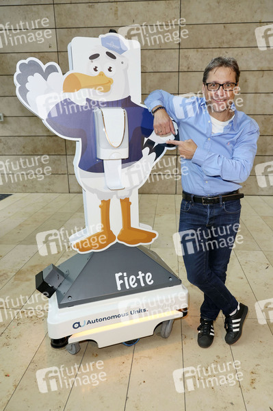 Patrick Bach beim Fototermin mit Service-Roboter 'Fiete', einem mobilen Spender für Hand-Desinfektionsmittel der Firma Autonomous Units, in der Europa Passage, Hamburg, 28.11.2022