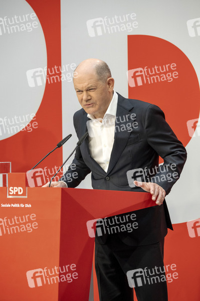 Olaf Scholz bei einer Pressekonferenz der SPD zu den Bundestagswahlen im Atrium des Willy-Brandt-Hauses. Berlin,24.02.2025