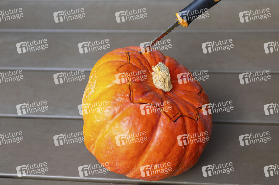 Kürbis schnitzen, Kürbisse, Cucurbita, Halloween, Herbst, Kürbisfruchtfleisch, Kürbiswände, Kürbis Gesicht, Kürbis-Schnitzset, Deko, Symbolbild, Themenbild