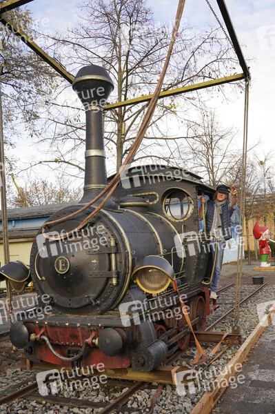 Ein weiteres Filmrequisit für die 'Giant Props' Sammlung ungewöhnlicher Originale, die Lokomotive Emma aus den Jim Knopf Filmen, wird auf der Straße der Giganten im Filmpark Babelsberg aufgestellt. Filmparkchef und 'Lokomotivführer' Friedhelm Schatz organisiert den Transport. Potsdam, 16.11.2020