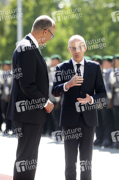 Friedrich Merz und Luc Frieden beim Empfang des Premierministers von Luxemburg mit militärischen Ehren zu einem gemeinsamen Gespräch mit anschließendem Pressestatement im Bundeskanzleramt. Berlin, 01.07.2025
