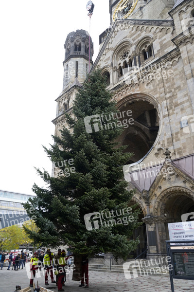 Aufstellung einer 17 Meter hohen Nordmanntanne für den Weihnachtsmarkt auf dem Breitscheidplatz vor der Kaiser-Wilhelm-Gedächtnis-Kirche. Berlin, 02.11.2021