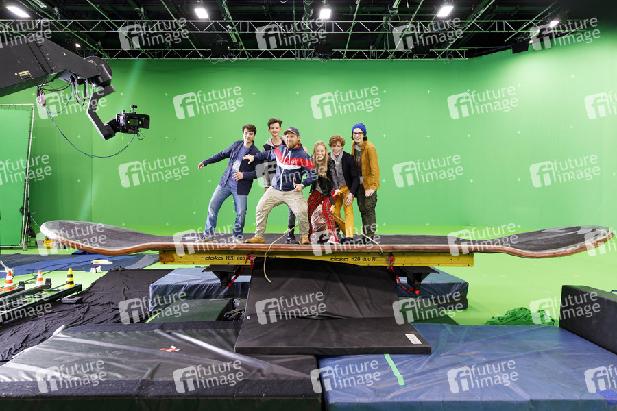 Oskar Keymer, Eloi Christ, Axel Stein, Lina Hüesker, Georg Sulzer und Maximilian Ehrenreich beim Fototermin am Set des Kinofilms 'Hilfe, ich hab meine Freunde geschrumpft' in den MMC-Studios in Ossendorf. Köln, 01.10.2019