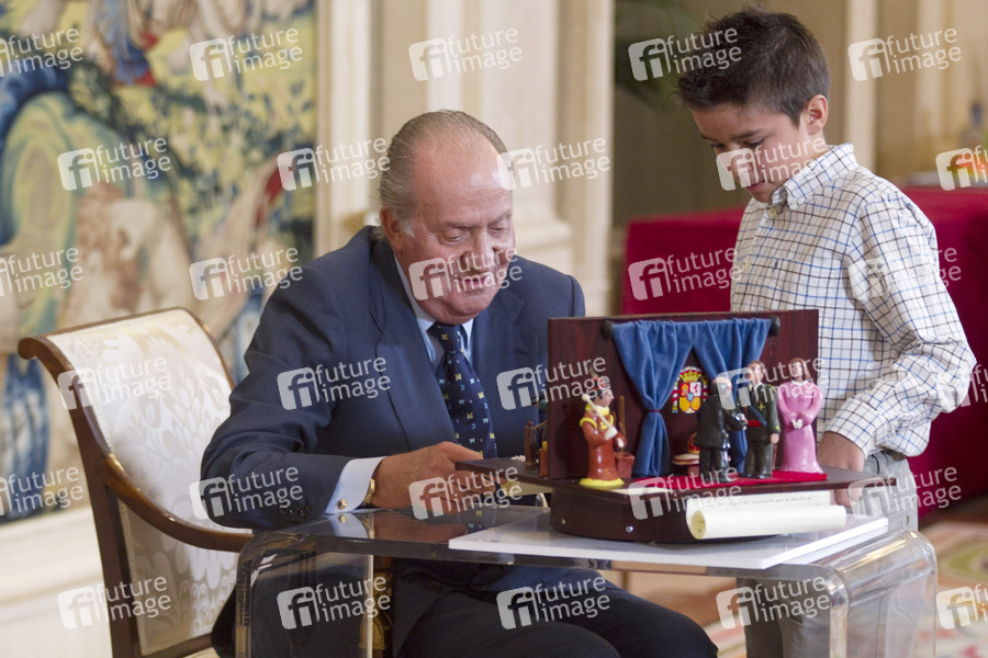 König Juan Carlos empfängt die Gewinner des 'Qué es un Rey para ti' Schulwettbewerbs im Zarzuela Palast, Madrid