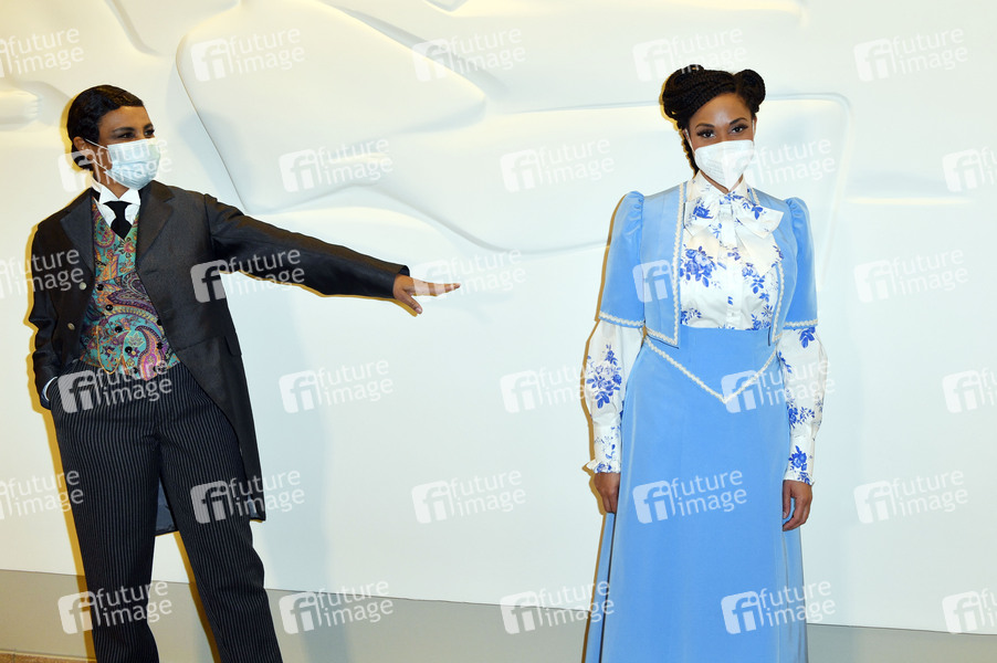 Adisat Semenitsch und Vanessa Rottenburg beim Fototermin mit dem (getesteten) Ensemble des Theaterstücks 'Vorhang auf für Cyrano' in Maske und Kostüm vor dem Testzentrum im Schiller Theater. Unter dem Motto 'Testen statt spielen' eröffnen die Komödie am Kurfürstendamm und der KitKatclub ein gemeinsames Testzentrum im Schiller Theater. Berlin, 07.04.2021