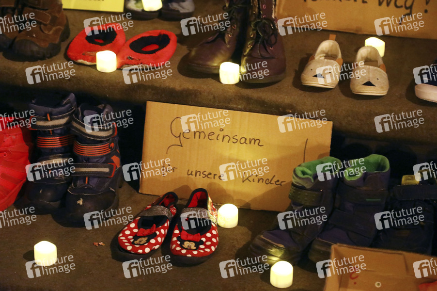Aus Protest gegen erneute Schulschließungen haben Eltern Kinderschuhe, Plakate und Banner vor dem Rathaus Görlitz abgelegt. Görlitz, .22.03.2021