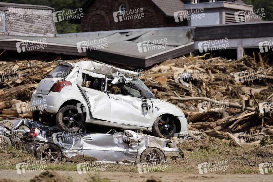 Nach dem Jahrhunderthochwasser in der Eifel durch heftige Regenfälle und Dauerregen mit Überschwemmungen und Überflutungen haben die Aufräumarbeiten im Ahrtal begonnen. Einheiten von Polizei, THW, Bundeswehr und Feuerwehr mitsamt vielen freiwilligen Helfern räumen Straßen, entfernen Schutt und Schlamm und versorgen die Menschen. Im Bild zerstörte Autos in der Ortschaft Rech, in der die Flut viele Häuser zerstörte, 22.07.2021
