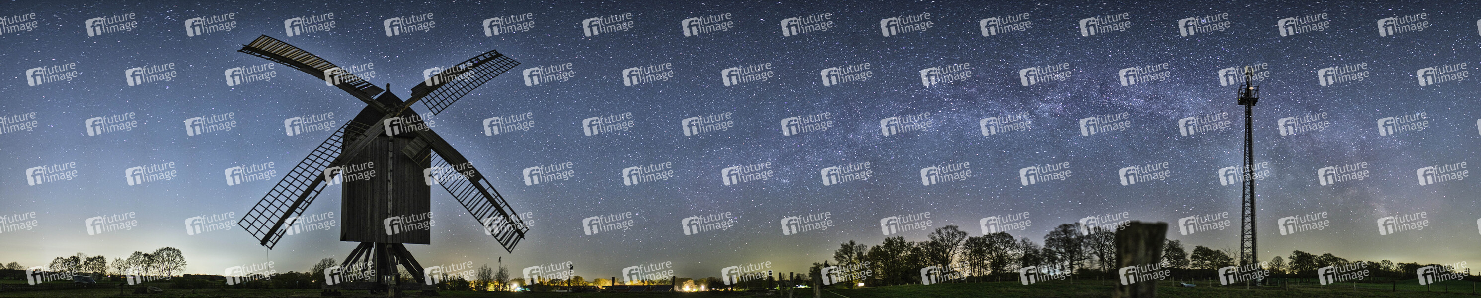 Sehenswürdigkeit, Sightseeing, Mühle, Windmühle, funktionsfähiges kulturhistorisches Denkmal, Ständermühle, Kastenmühle, Mühlenhaus, Hausbaum, technisches Bauwerk, Flügle, Windmühlenflügel, Windenergie, Energieumwandlung, Nacht, Sterne, Sternenhimmel, Panorama