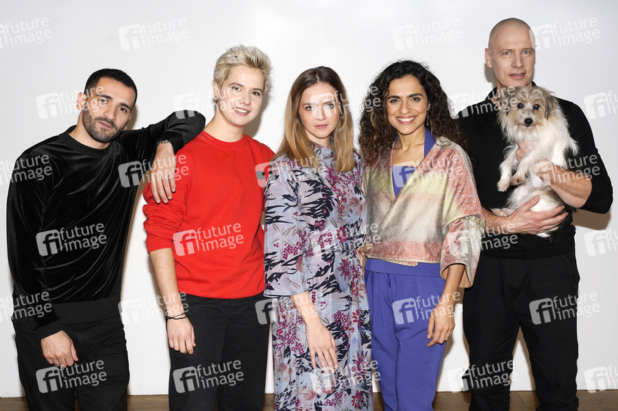 Hassan Akkouch, Melina Borcherding, Sarina Radomski, Sesede Terziyan, Christoph Grunert und der Hund Stulle beim Fototermin zur ARD Krimi-Serie 'WaPo Berlin' im 25hours Hotel Bikini. Berlin, 05.12.2019