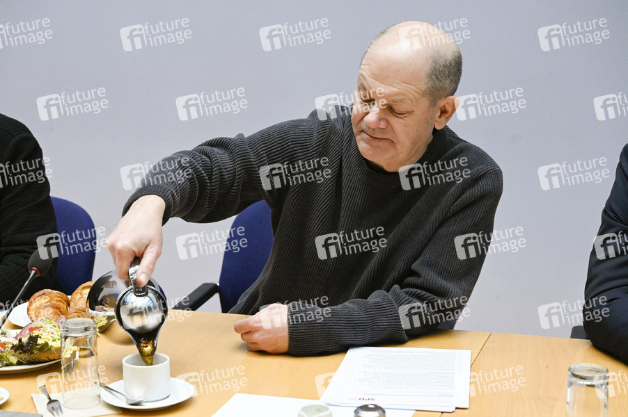 Olaf Scholz bei Beratungen im Rahmen einer Klausur des SPD-Parteivorstandes in der Landesvertretung Hamburg beim Bund. Berlin, 16.03.2024