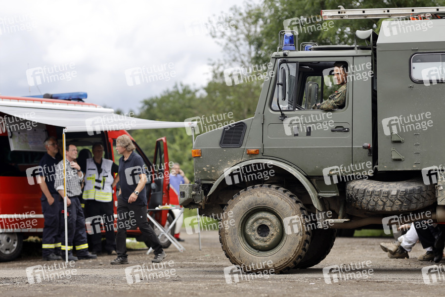 In der Eifel haben heftige Regenfälle und Dauerregen für Überschwemmungen und Überflutungen gesorgt. Im Ahrtal trat der Fluss vielerorts über die Ufer und überschwemmte nicht nur Keller sondern ganze Ortschaften. Im Bild das Camp der Rettungskräfte in den Bergen über dem Ort Dernau (Landkreis Ahrweiler), der beinahe komplett von den Wassermassen geflutet wurde. Viele Menschen verloren alles. Dernau, 15.07.2021
