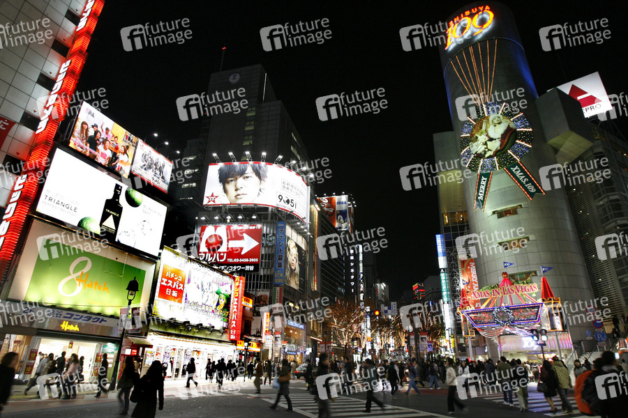 Geschäfte, Kaufhäuser, Neonlichter, Neonreklame, Werbung, Kreuzung, Fußgänger, Passanten, Weihnachten, X-Mas, Christmas