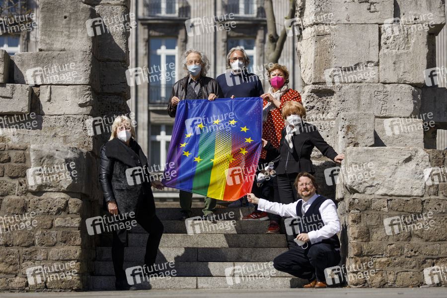 Jean Pütz, Gerd Kaspar und weitere Unterstützer zeigen eine Europa-Flagge, die in eine Regenbogenflagge übergeht, um die Bewegung Pulse of Europe zu unterstützen. Köln, 23.04.2021
