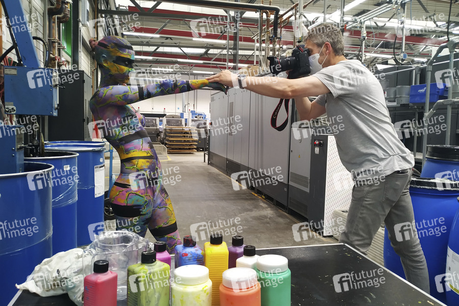 Model Lisa mit Projektfotograf Tschiponnique Skupin - Jörg Düsterwald, einer der bekanntesten Bodypainting- und Bodyartkünstler Deutschlands macht auf seine ganz eigene Art auf die prekäre Situation freischaffender Künstler während der Corona-Pandemie aufmerksam: Unter dem Hashtag #WirzeigenFarbe hat der Hamelner Künstler in der Produktionshalle der Druckerei QUBUS media mit seinem Model Lisa ein ausdruckstarkes Live-Bodypainting inszeniert - denn Künstlerinnen und Künstler wie er sehen und fühlen sich derzeit wortwörtlich 'ausgezogen bis aufs letzte Hemd'. Und nichts symbolisiert diesen bekannten Spruch besser als ein Bodypainting auf nackter Haut in einer Umgebung, in der es jeden Tag um Farbe geht. Die Live-Performance fand mit dem zeitgleichen Druckstart von Jörg Düsterwald's neuem Premiumkalender 'Bodypainting in Nature 2021' statt. Hannover, 14.07.2020