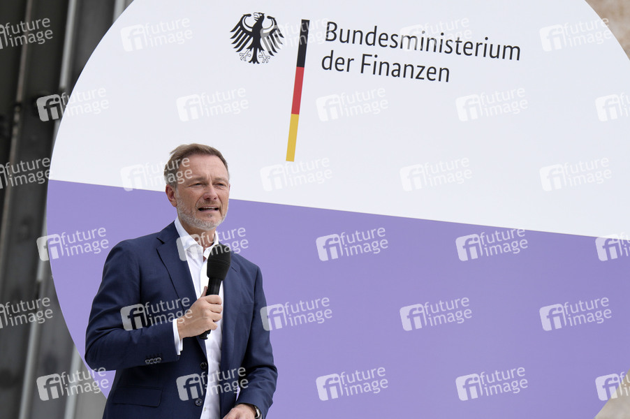 Christian Lindner bei der Präsentation des Sonderpostwertzeichens und der 11-Euro-Sammlermünze UEFA Fußball-Europameisterschaft 2024 im Bundesministerium der Finanzen. Berlin, 21.05.2024