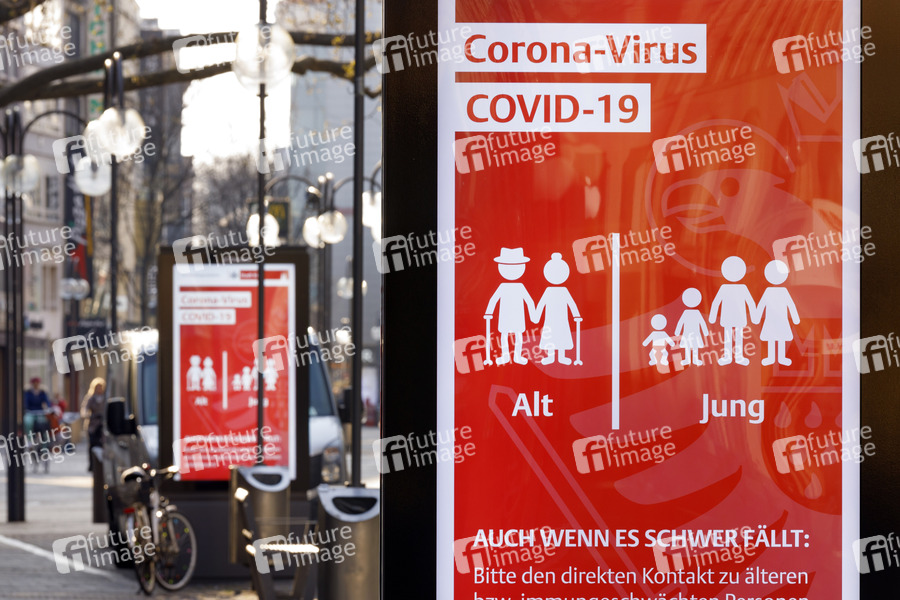 Eine Hinweistafel zum Verhalten mit Risikogruppen für Corona während der Coronakrise. Köln, 12.04.2020