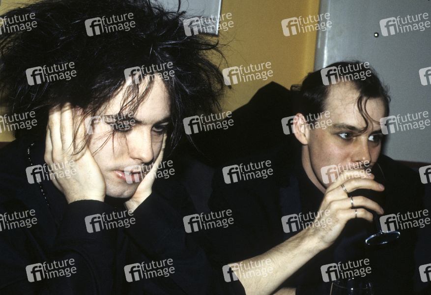 Robert Smith und Porl Thompson von The Cure bei einem Pressetermin anlässlich ihrer World Tour in der Zansibar. London, 10.04.1984